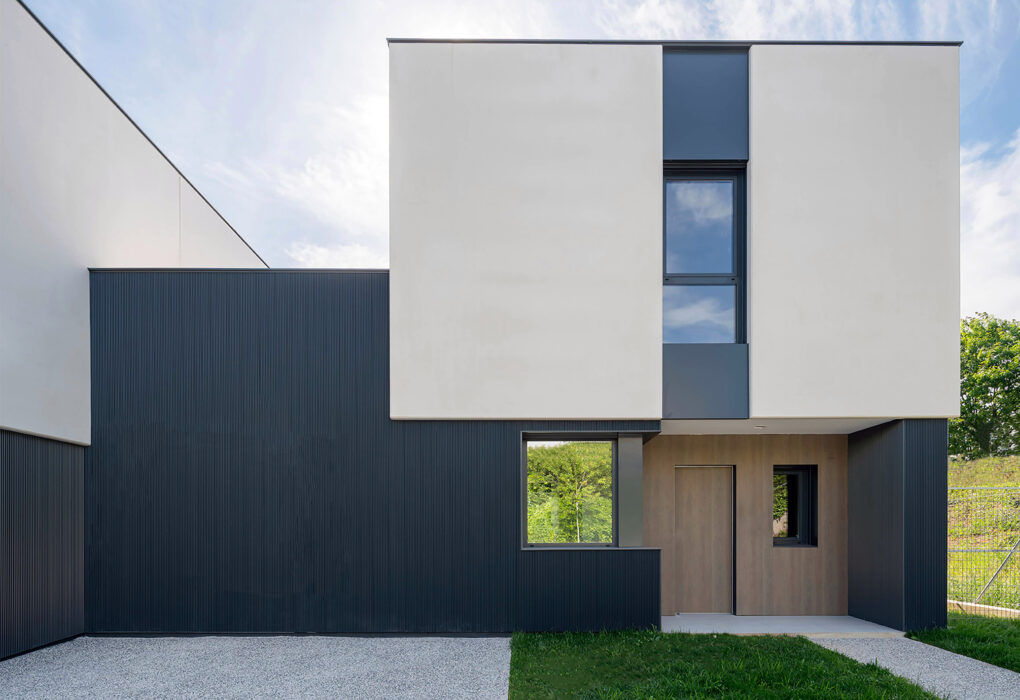 En fase 1, las viviendas se sitúan más cercanas a la alineación (fachada de acceso), donde se produce el acceso y aparcamiento al exterior en superficie (este) a cota de planta baja, y dejando por tanto el principal espacio exterior de la parcela hacia su fachada trasera (oeste), con un carácter más privado e íntimo, donde existe la posibilidad de ubicación de una piscina por vivienda (no objeto de éste proyecto).