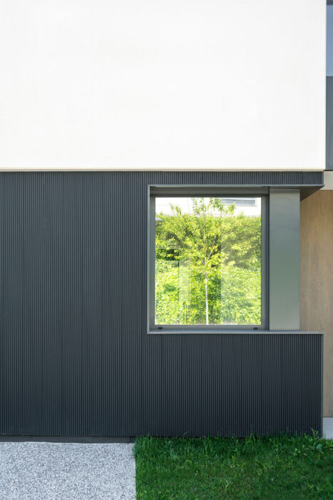 – Planta primera: La planta alta no ocupa la misma huella que la planta baja, dejando una franja libre sobre el trastero –lavadero y la sala polivalente. Esta zona libre se aprovecha para una gran terraza accesible desde el dormitorio y baño común. Esta planta vuelve a distribuirse en dos franjas al igual que la planta baja. En la franja de fachada de acceso se dispone de dos dormitorios secundarios, y en la franja de fachada trasera volada dando al jardín se sitúa el dormitorio principal y el baño en suite. En el centro de esta planta se sitúa la escalera y el baño común principal.