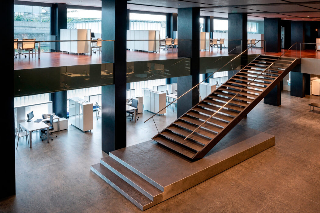 En la entreplanta se modifica la zona perimetral al espacio en doble altura, quedando integrada la nueva escalera. Se eliminan mamparas y tabiques, dejando espacios de oficina diáfanos en ambos cuerpos.