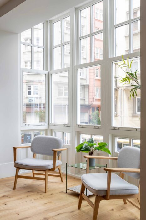 Junto con estas mejoras técnicas, el proyecto pone especial atención en respetar y conservar la estética original del inmueble, manteniendo sus proporciones, elementos característicos y lenguaje arquitectónico en fachada. El objetivo es garantizar una intervención contemporánea y funcional que dialogue con la identidad histórica del edificio y su entorno urbano, sin renunciar a los estándares actuales de habitabilidad, sostenibilidad y eficiencia energética.